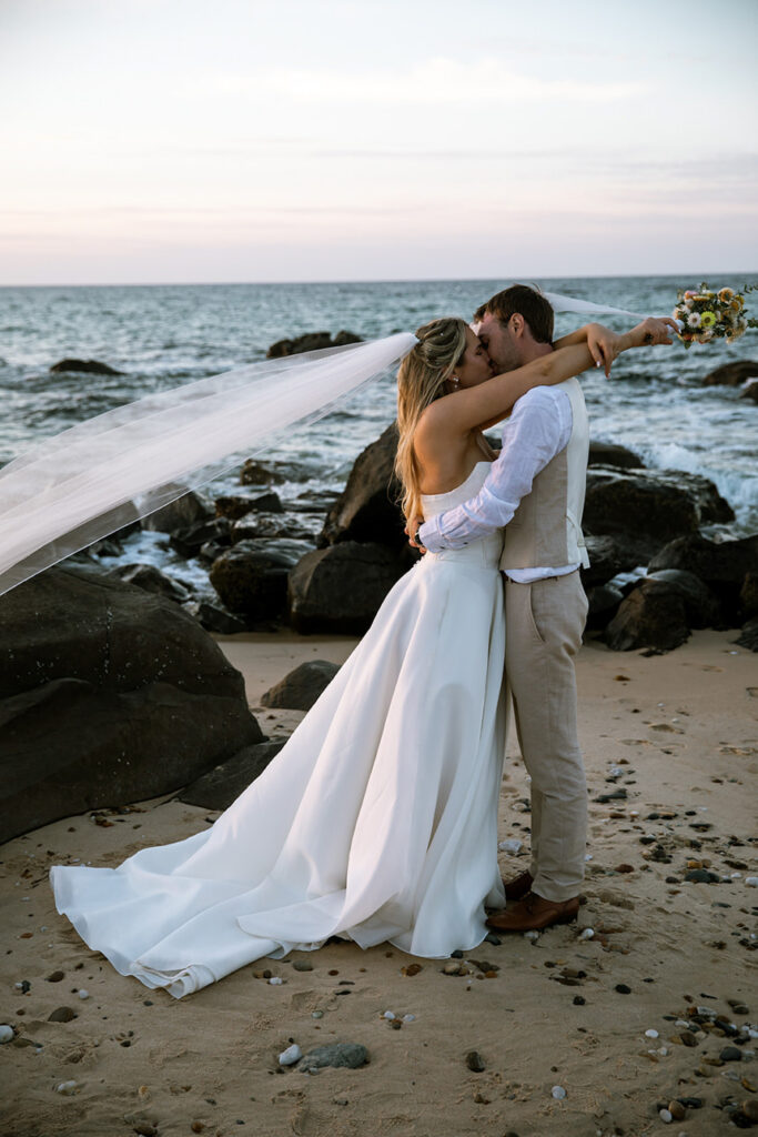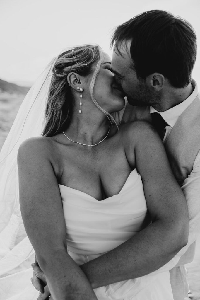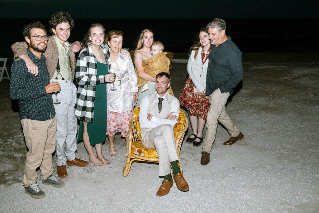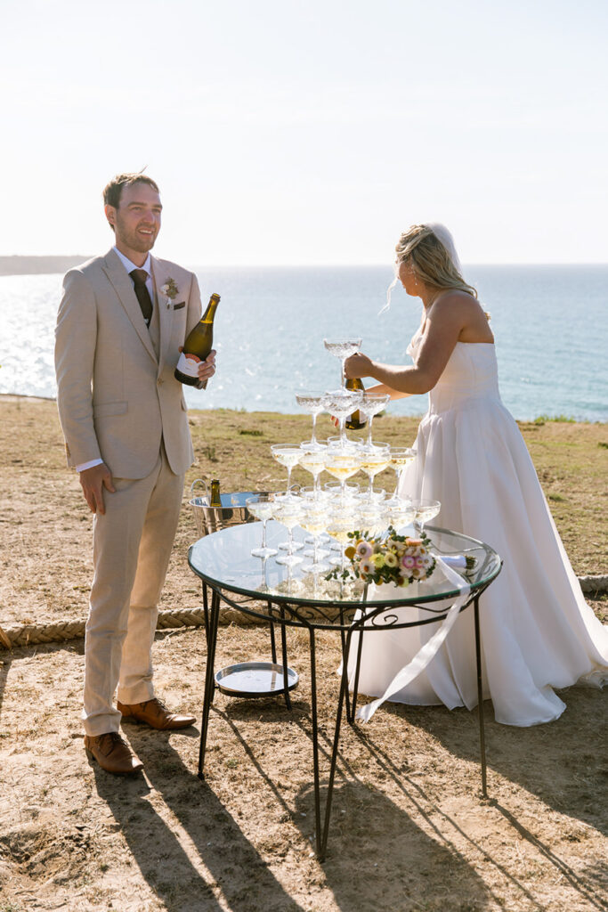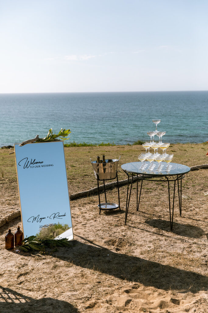 We started the afternoon with some relaxed photos of the bridal party and guests at the ceremony spot, complete with a champagne tower that kicked off the celebrations in style. After giving everyone time to unwind and mingle, we wandered down to the beach for romantic sunset portraits of Megan and Rennick — a quiet, heartfelt moment before heading back to join their loved ones.