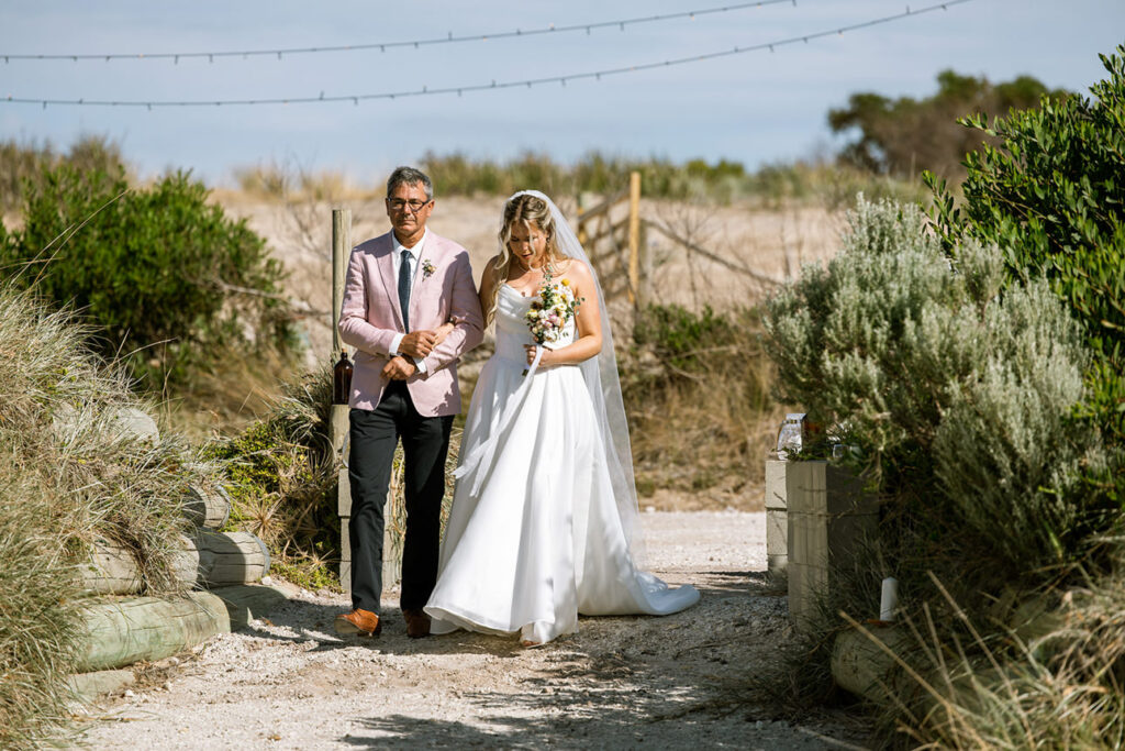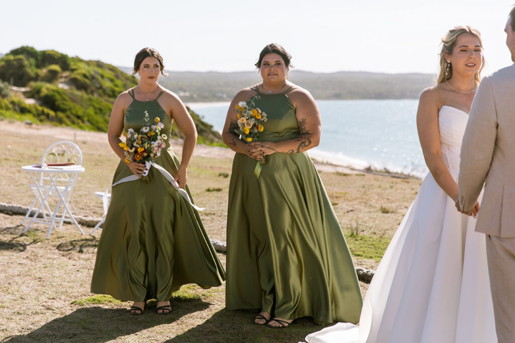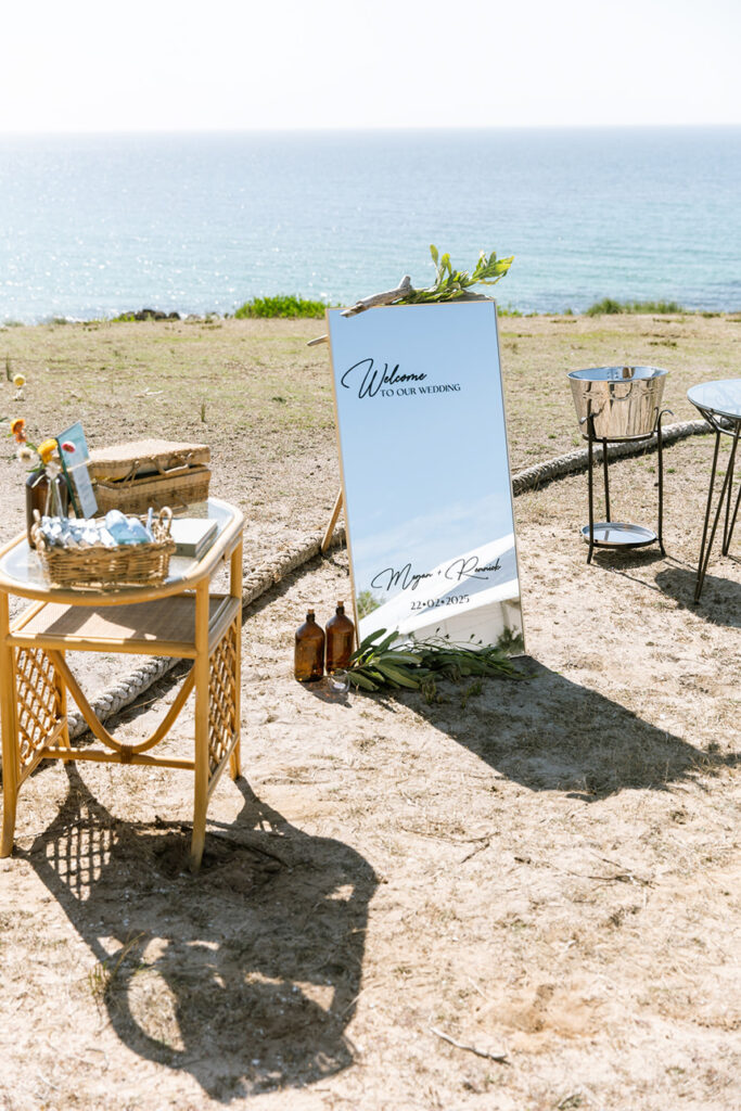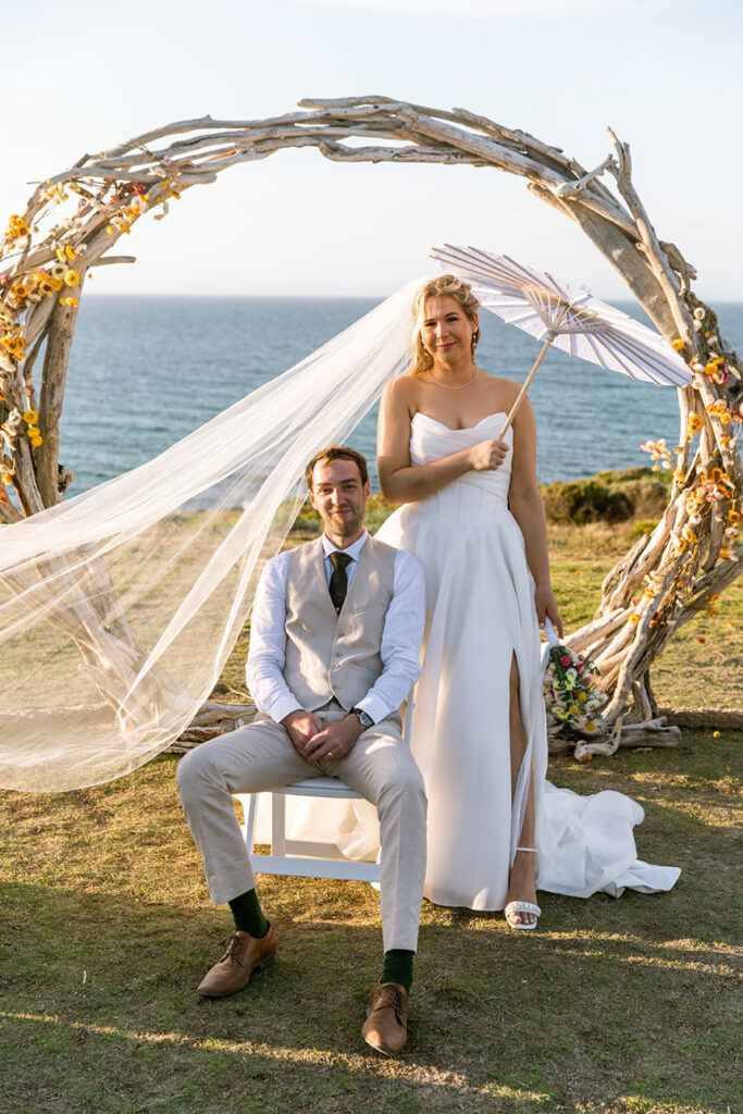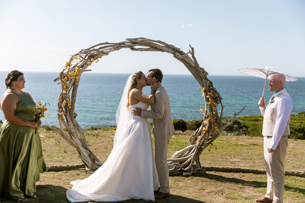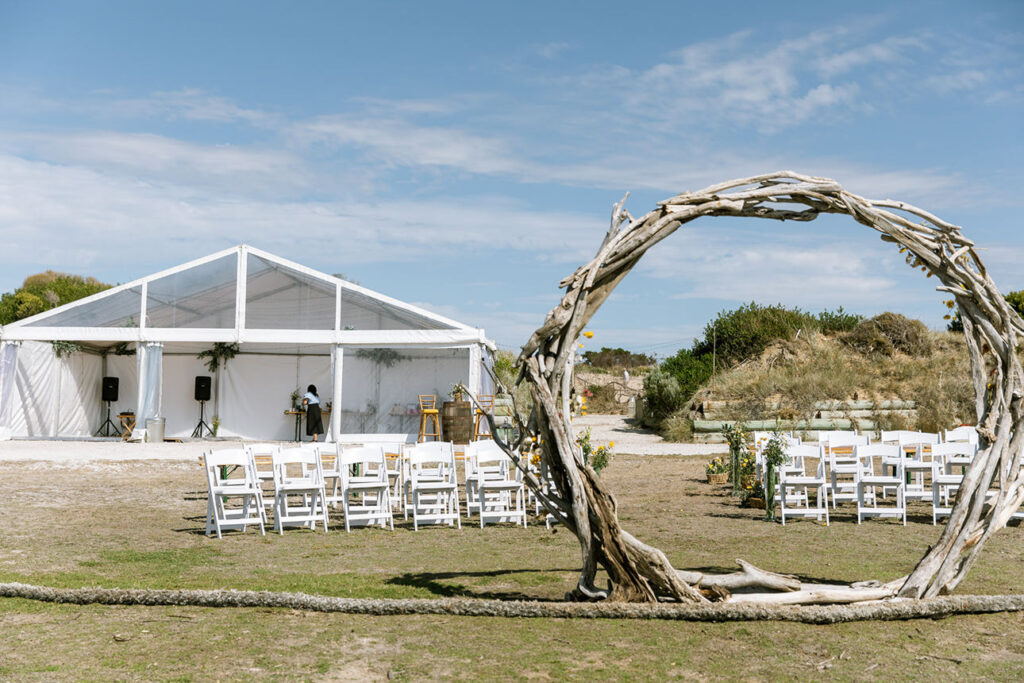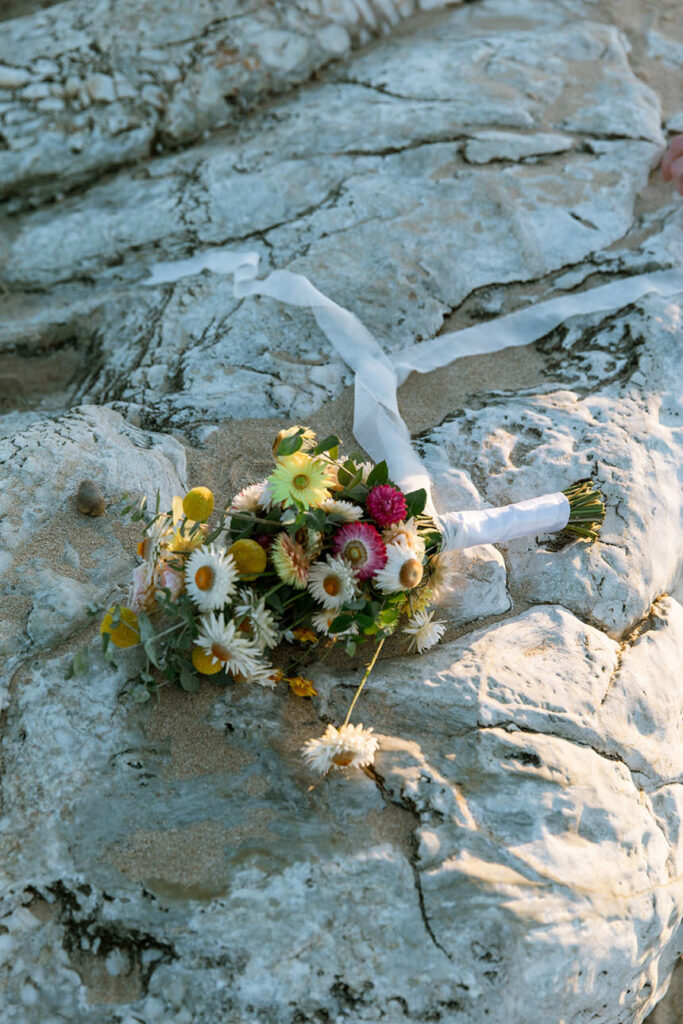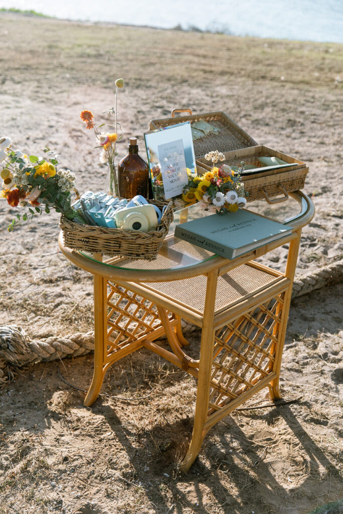 The styling was simple, sustainable, and perfectly in tune with the setting. Native flowers, driftwood collected from the beach, vintage baskets, and delicate parasols created an atmosphere that was both beautiful and environmentally conscious — a reflection of Megan and Rennick’s values, and the heartfelt celebration they wanted to share with their closest people.
