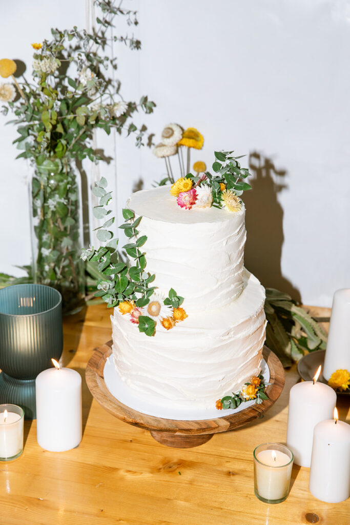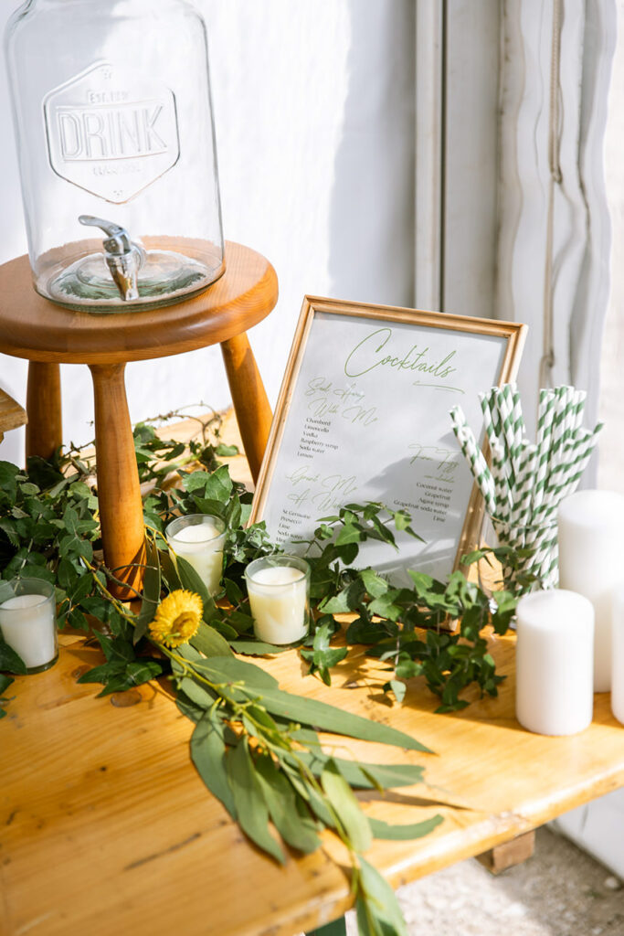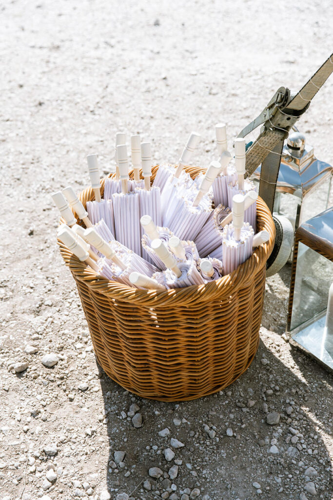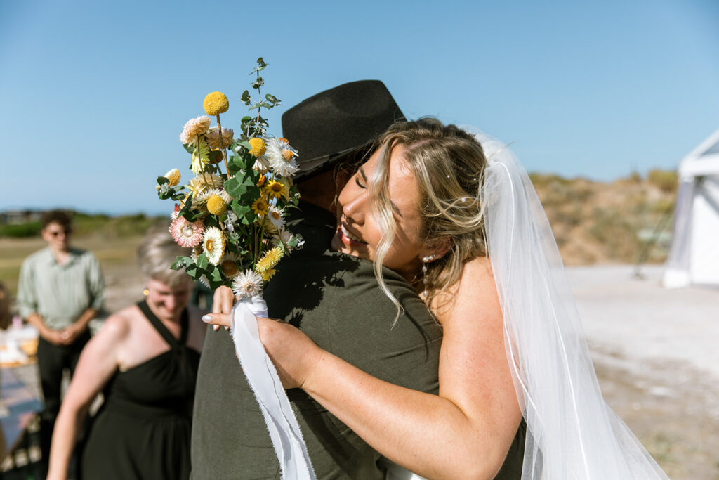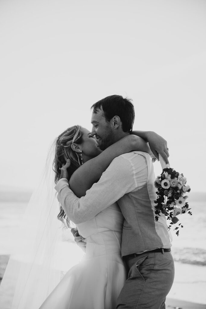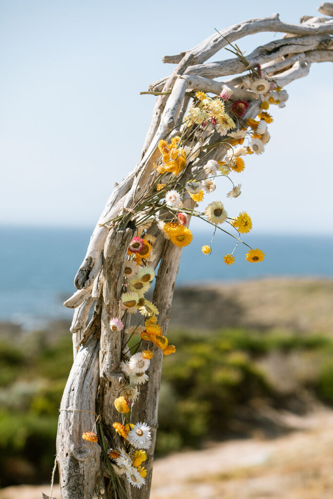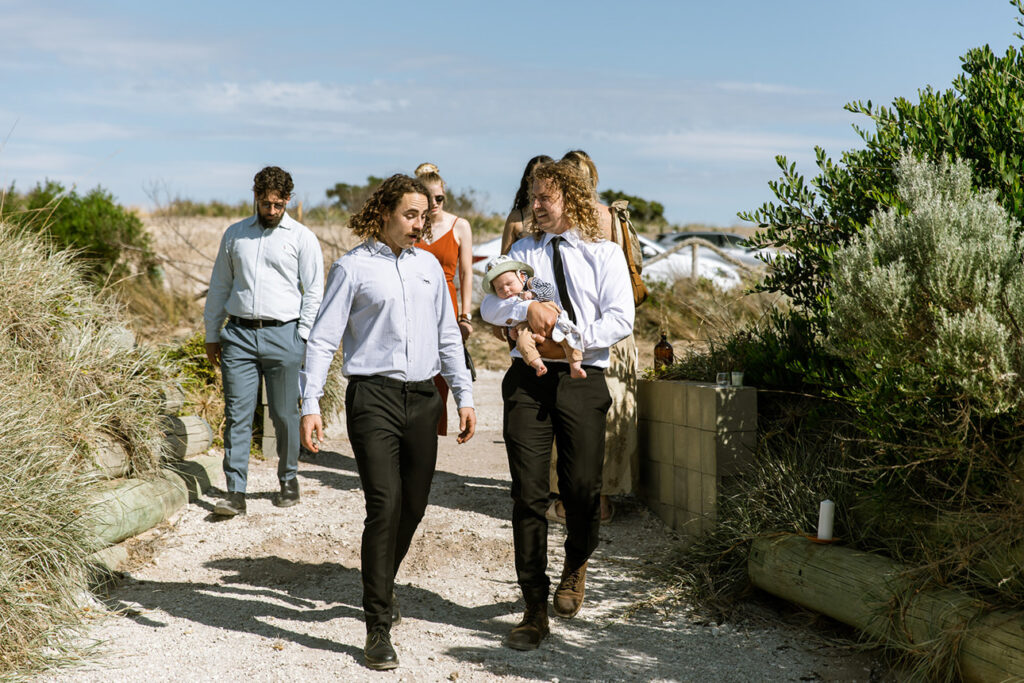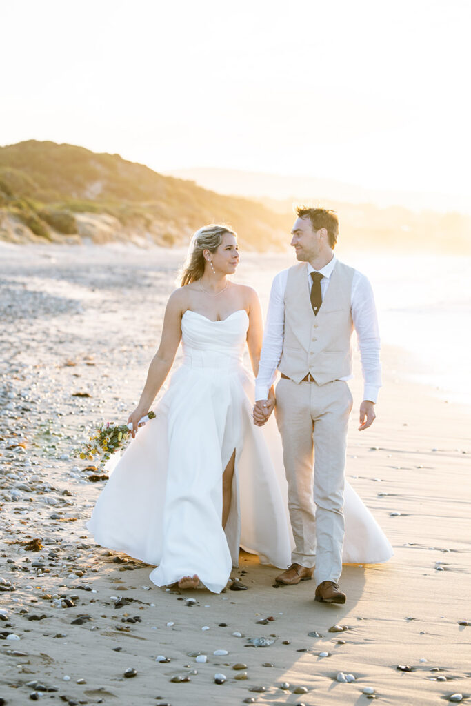 The styling was simple, sustainable, and perfectly in tune with the setting. Native flowers, driftwood collected from the beach, vintage baskets, and delicate parasols created an atmosphere that was both beautiful and environmentally conscious — a reflection of Megan and Rennick’s values, and the heartfelt celebration they wanted to share with their closest people.