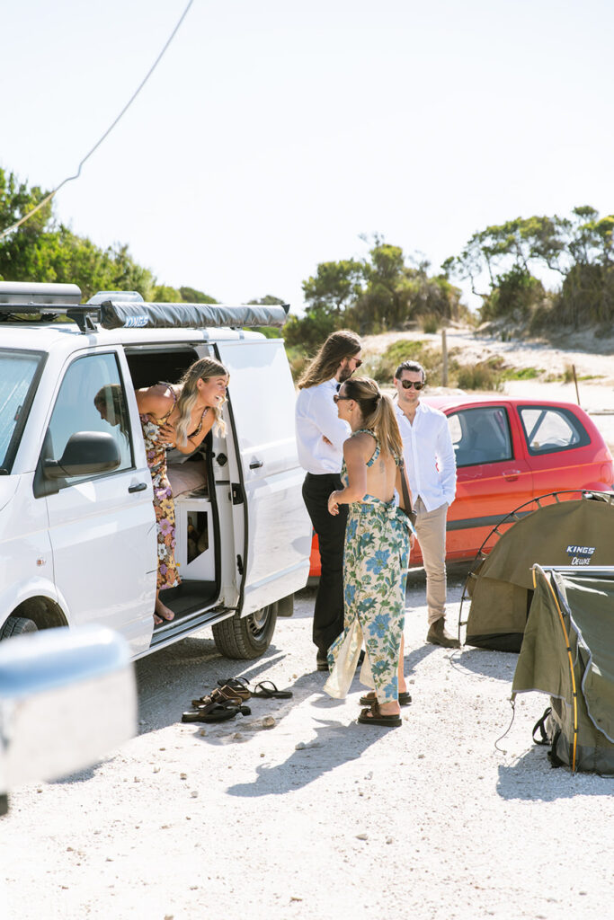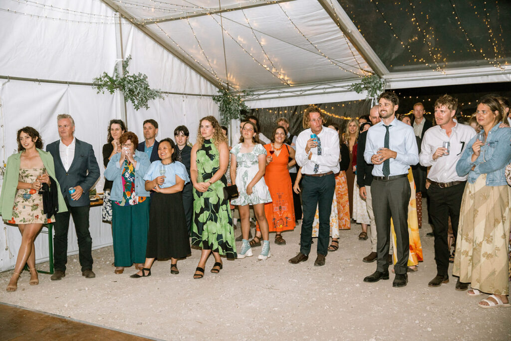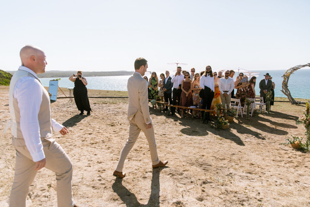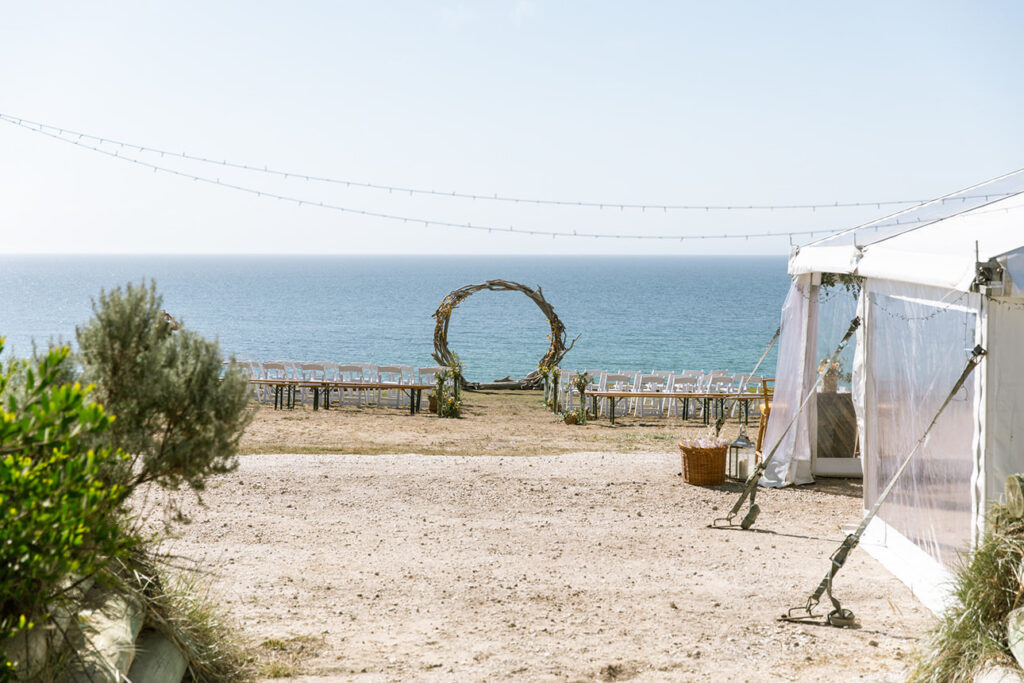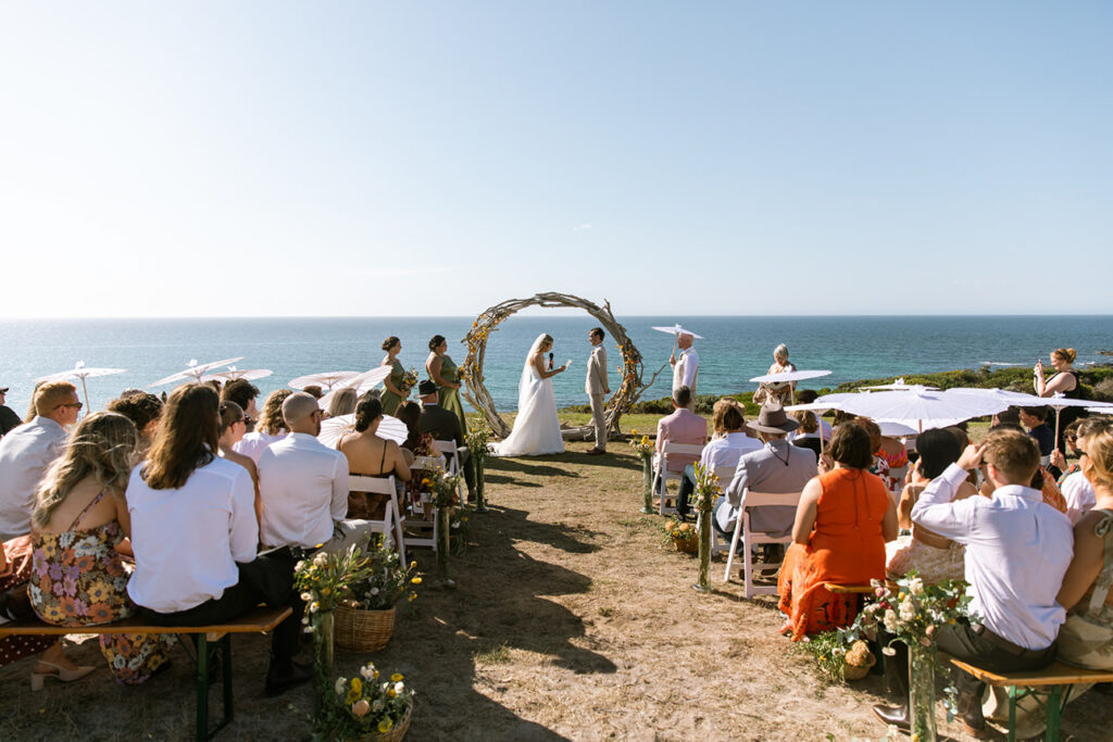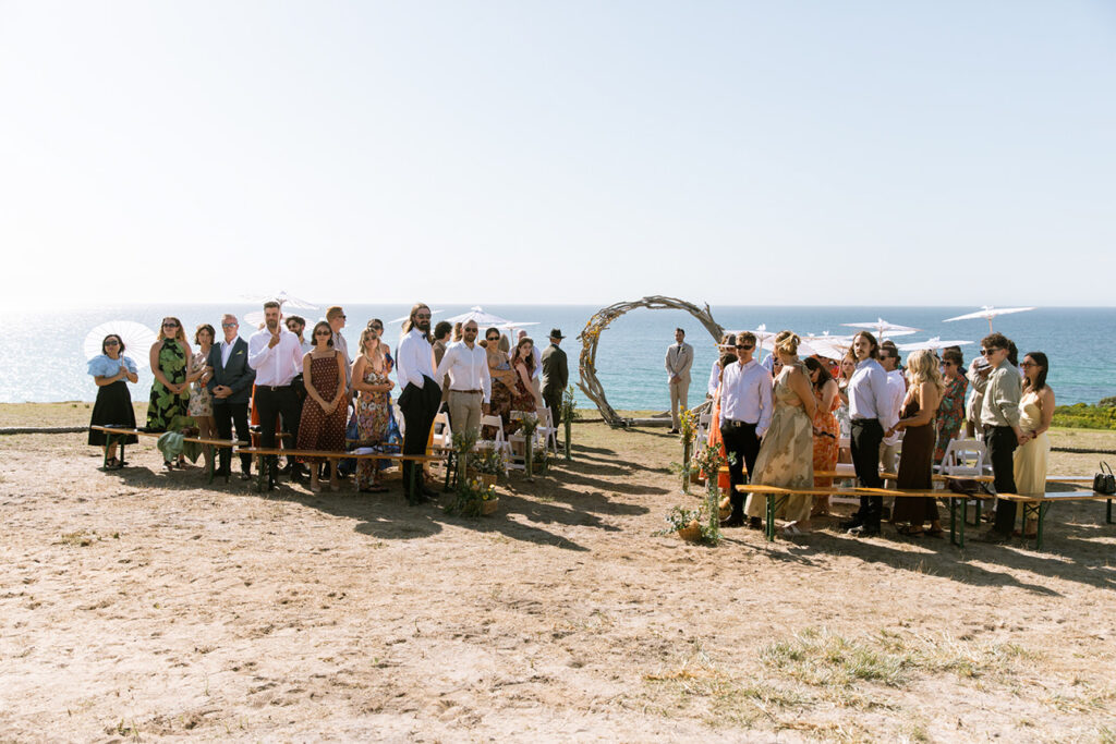 Nature plays a huge role in their lives — from camping trips and bush walks to simple moments spent by the beach. It was no surprise that their friends shared the same adventurous spirit. In fact, half of the guests arrived with swags and tents, ready to camp out under the stars at the cliff-top venue.