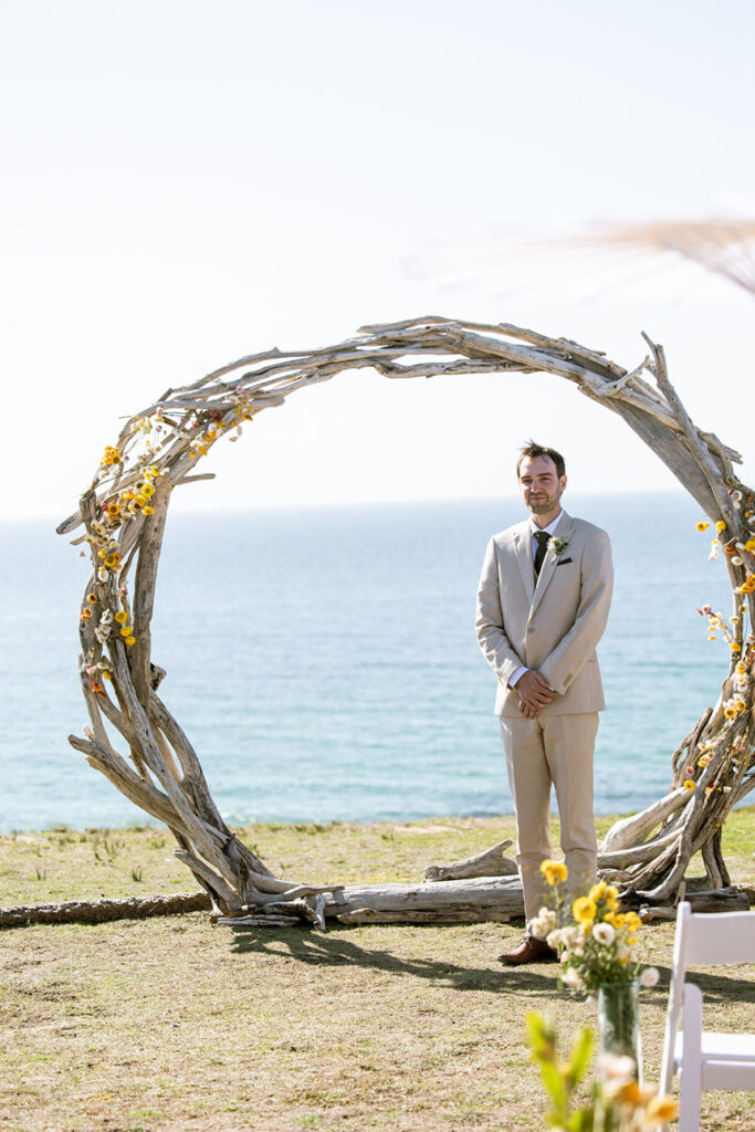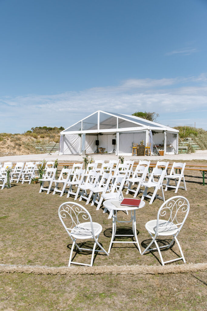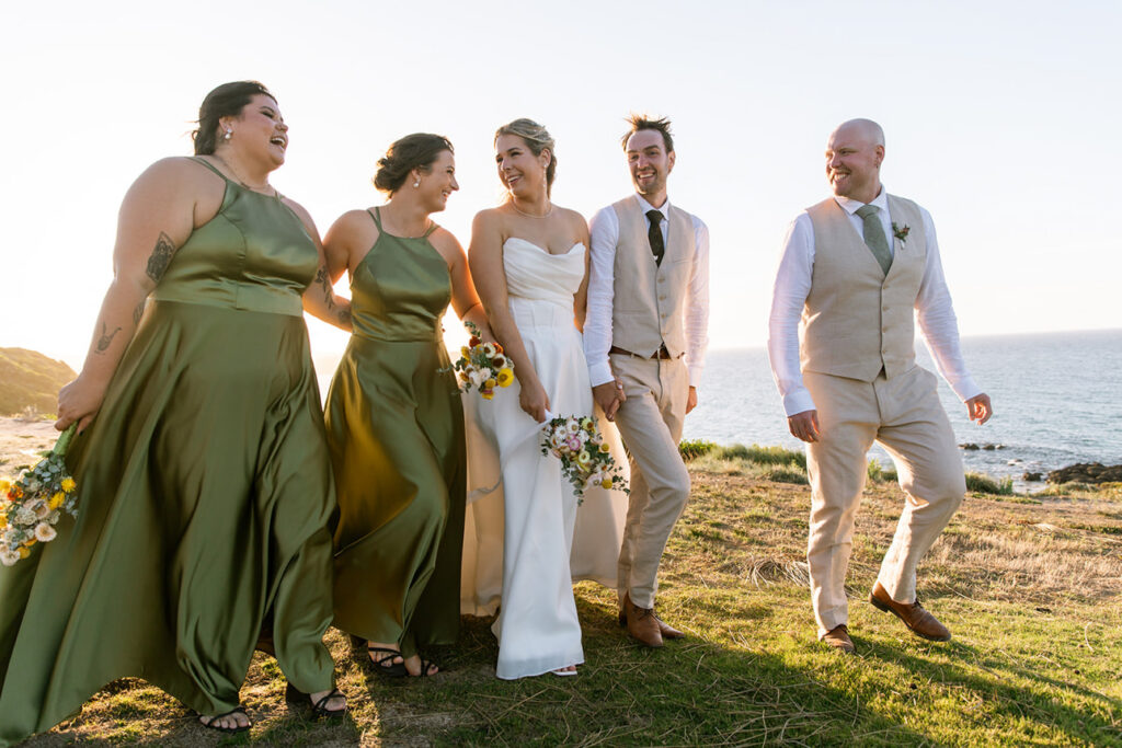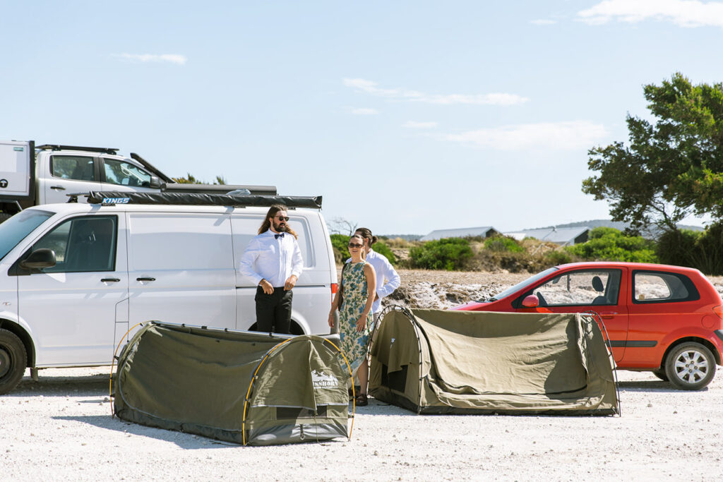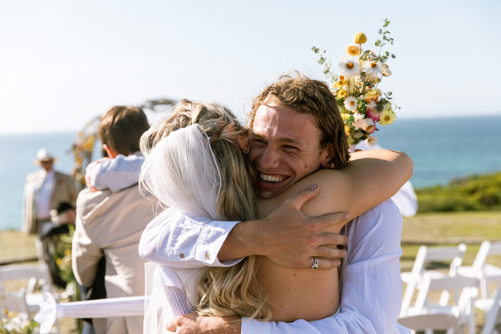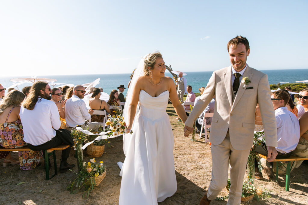 Nature plays a huge role in their lives — from camping trips and bush walks to simple moments spent by the beach. It was no surprise that their friends shared the same adventurous spirit. In fact, half of the guests arrived with swags and tents, ready to camp out under the stars at the cliff-top venue.