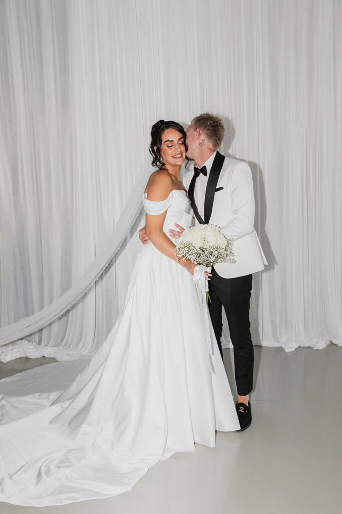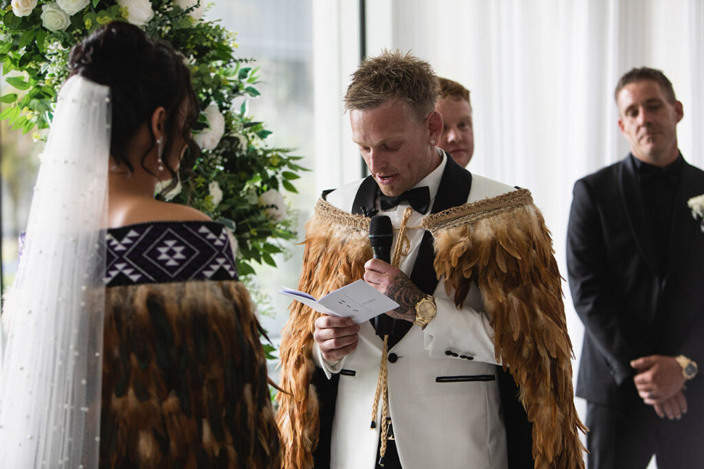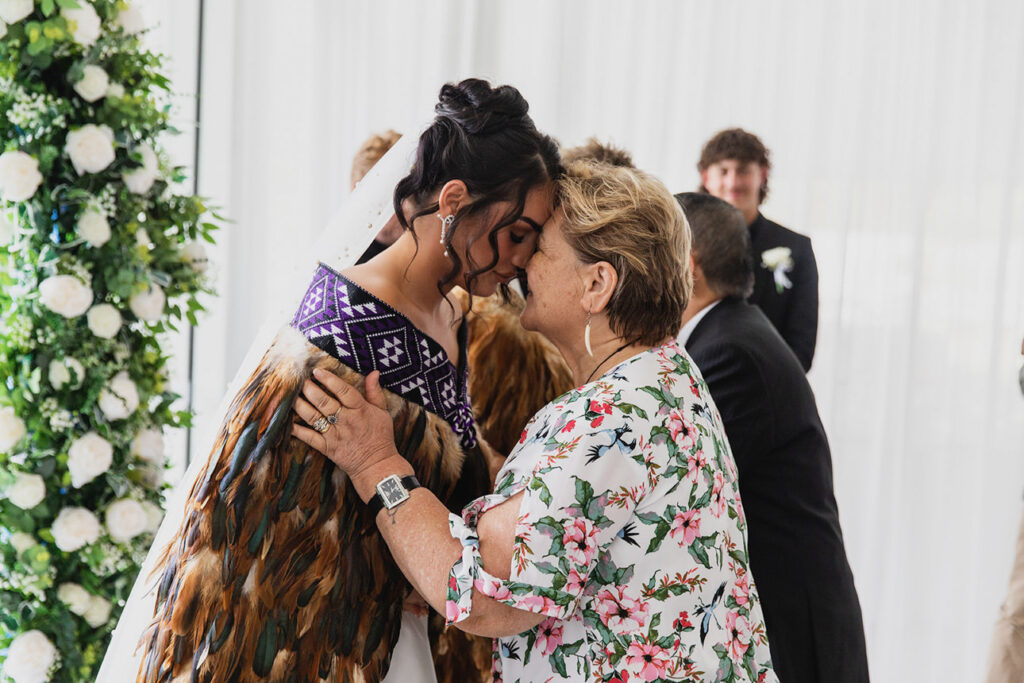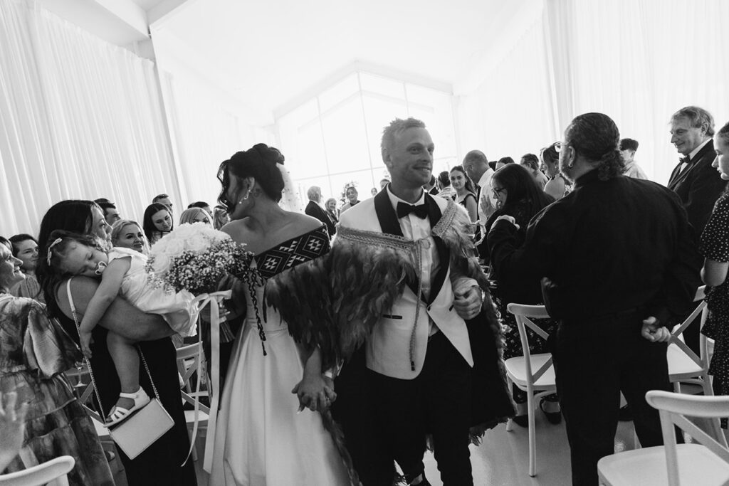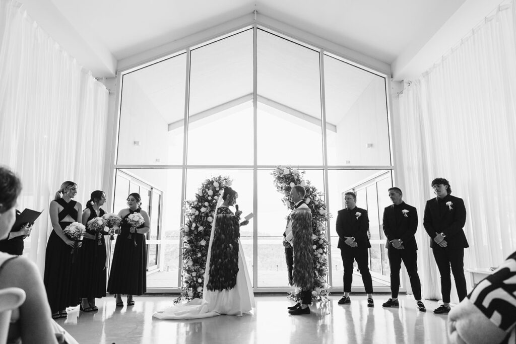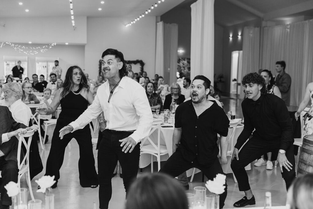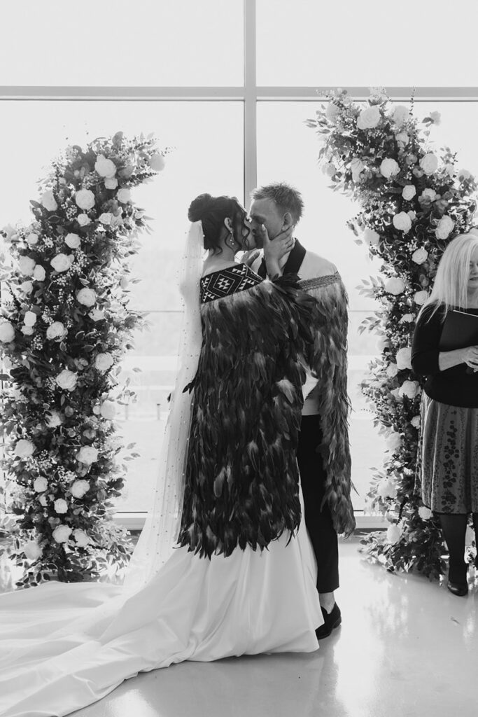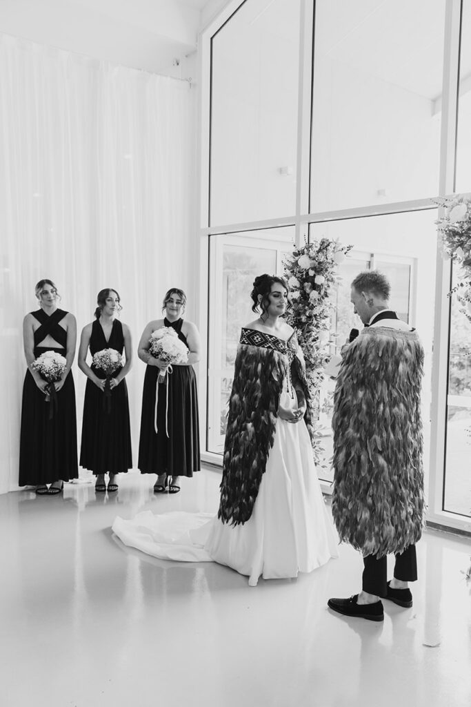 The ceremony was especially powerful, honouring Amber’s Māori heritage in a way that moved every guest. Both Amber and Justin wore traditional feather cloaks, symbolising strength and connection. Later, her relatives performed a haka at the reception—a moment of energy and emotion that became one of the defining highlights of the day. The venue itself also carried meaning. Chosen not only for its modern elegance, it also featured trees native to New Zealand. These became the backdrop for family portraits, creating a heartfelt connection to Amber’s heritage woven seamlessly into the setting.