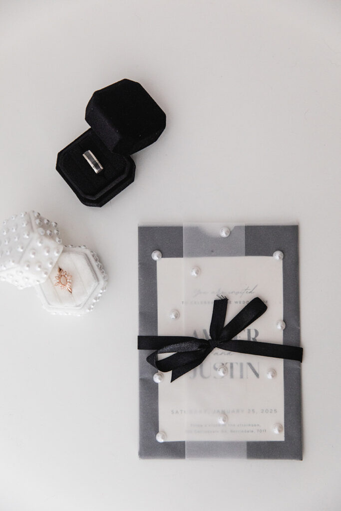 Amber infused the day with her own creativity. She designed and DIY’d the wedding invitations, styled the flowers, and incorporated her love of pearls throughout. Pearls adorned her veil and even made their way into the invitations, adding soft, romantic details that beautifully contrasted the crisp black and white theme.